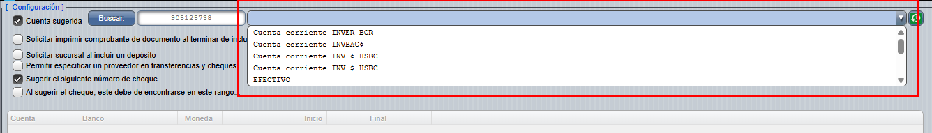 - Cuenta sugerida: Primeramente, vamos a configurar la cuenta corriente de la compañía,es decir definir una cuenta por defecto marcando el check que sería la cuenta corriente sugerida al incluir movimientos o generar reportes.