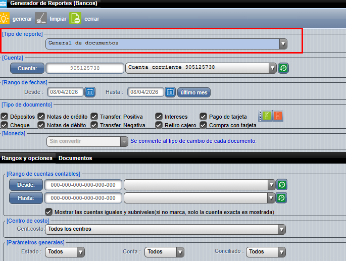 Para ingresar al generador de reportes en bancos, nos dirigimos al Menú => Reportes => Generador de reportes: