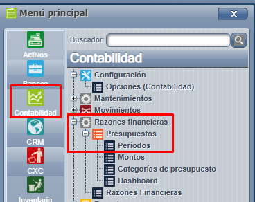 Para proceder con la primer configuración del proceso, debemos ingresar a Menú => Contabilidad => Razones financieras => Presupuestos => Períodos: