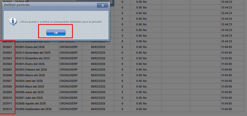 Una vez que presionemos aceptar en la pantalla anterior, el sistema nos creará en la pantalla principal el detalle por cada línea de los meses del año digitado. Lo único es presionar OK para confirmar al sistema el proceso: