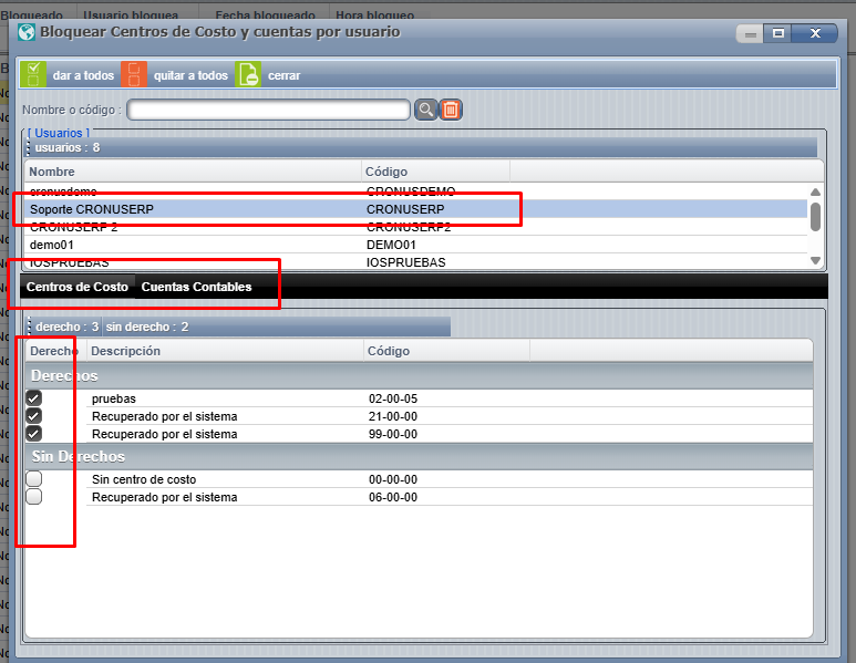 La pantalla está dividida en dos, en la parte superior verá la lista de usuarios y en la parte inferior los Centros de Costos y el Catálogo Contable, esto se debe de realizar por usuario. Haga un click sobre el usuario para marcarlo y luego en la parte inferior de la pantalla defina las cuentas a las que el usuario va a tener derecho para trabajar. Si la casilla al lado izquierdo del nombre está marcada el usuario puede trabajar con esa cuenta en el presupuesto, si no está marcada no va a poder trabajar en el presupuesto con esa cuenta: