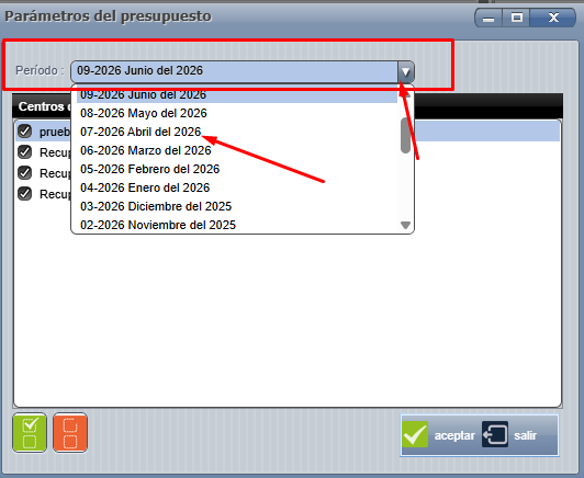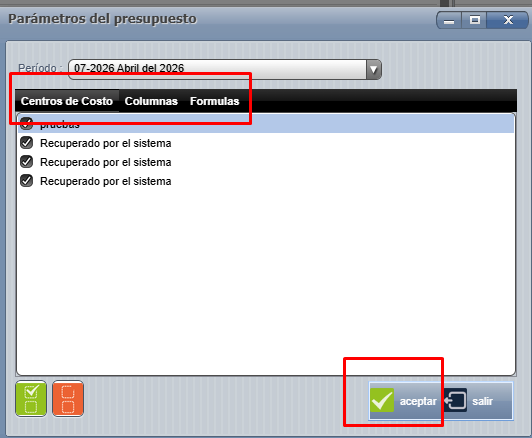 Además puede filtrar por centro de costo y definir las columnas a comparar, únicamente debe de marcar con un check las elegidas. Por último presione el botón "Aceptar":