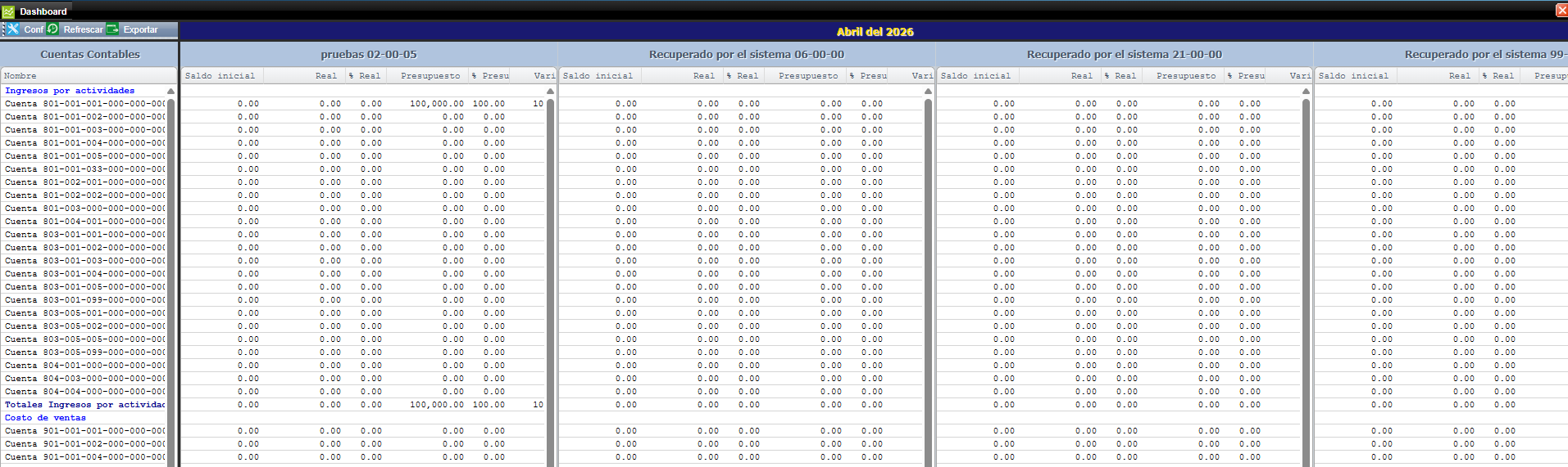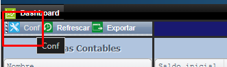 - Dashboard: Aquí podrá ver en pantalla la comparación del presupuesto VS una cuenta contable elegida para un período determinado. Ingrese desde el menú principal de contabilidad ==> Razones financieras ==> Presupuestos ==> Dashboard, presione el botón "Configuración" para que pueda filtrar la información que desea ver en pantalla.