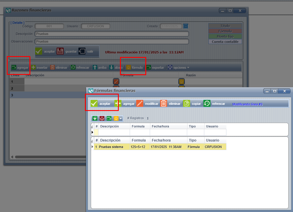 Una vez acá, se debe presionar agregar, el sistema mostrará una pantalla para cargar el detalle posteriormente presionar agregar en la misma pantalla para incluir las líneas y fórmulas respectivas por cada una de estas. Lo primero es una vez agregada la línea, presionamos fórmula y el sistema mostrará la pantalla para seleccionar la que deseamos incluir en la misma, una vez seleccionada solamente se debe presionar aceptar: