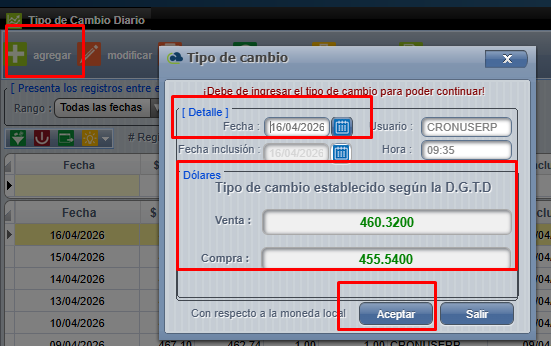 Si se requiere ingresar algún tipo de cambio o que no se guardó al iniciar sección presionamos "Agregar",llenamos los campos requeridos y luego "Aceptar" para guardar el cambio: