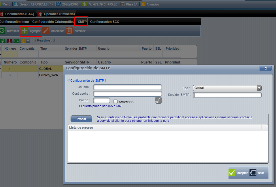 Se abren 3 pestañas, presiona donde dice SMTP preciosa el botón de "Agregar".