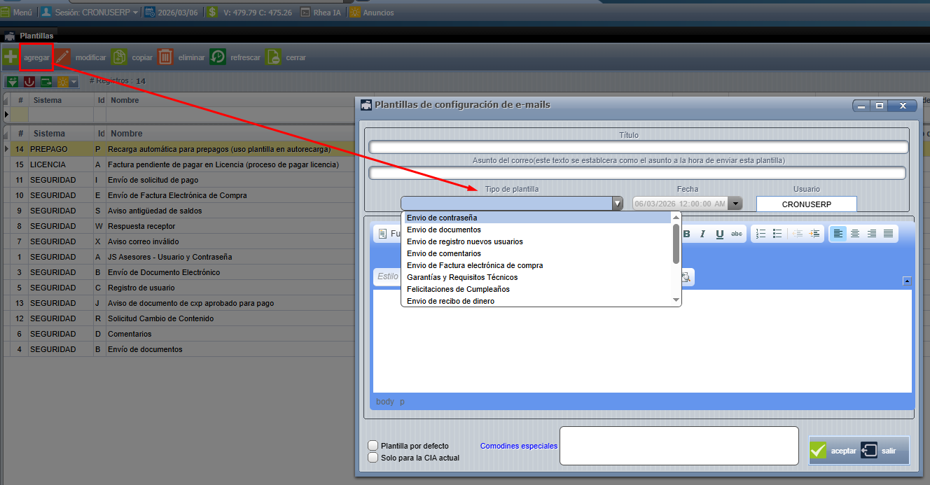 En esta configuramos las que requerimos, solamente debemos presionar agregar y ahí llenar la información que deseamos para nuestra plantilla podemos usar los comodines que nos muestra el sistema también.