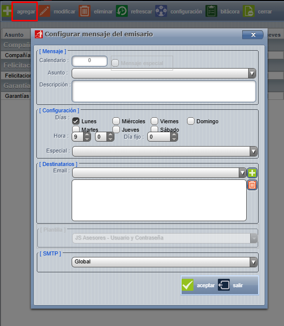 Únicamente en esta pantalla elegimos el de cumpleaños, presionamos modificar o agregar ( si es nuevo ) y debemos configurar el horario en que deseamos se envíe el correo y que plantilla usar.