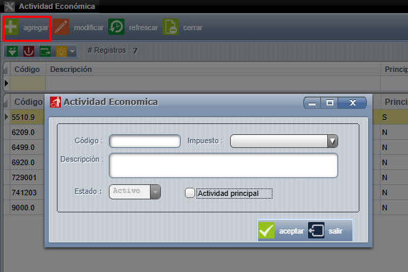 Una vez acá, presionamos agregar para ingresar la actividad en dicha pantalla debemos completar los datos requeridos ( el impuesto debe ser configurado en caso de que sea uno distinto al 13% de lo contrario no se configura dicha opción y así el sistema agrega por defecto el 13% ) , importante marcar el indicador de " Actividad principal " para la que corresponde: