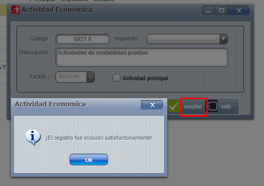 Cuando completamos los datos de la pantalla anterior,basta con presionar aceptar para guardar los cambios y confirmar el mensaje final: