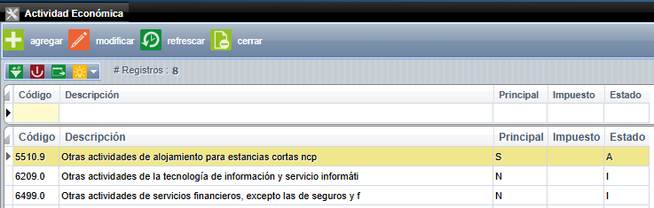 Desde esta pantalla debemos configurar la actividad económica de la compañía y la cual será utilizada para la generación de los comprobantes electrónicos.