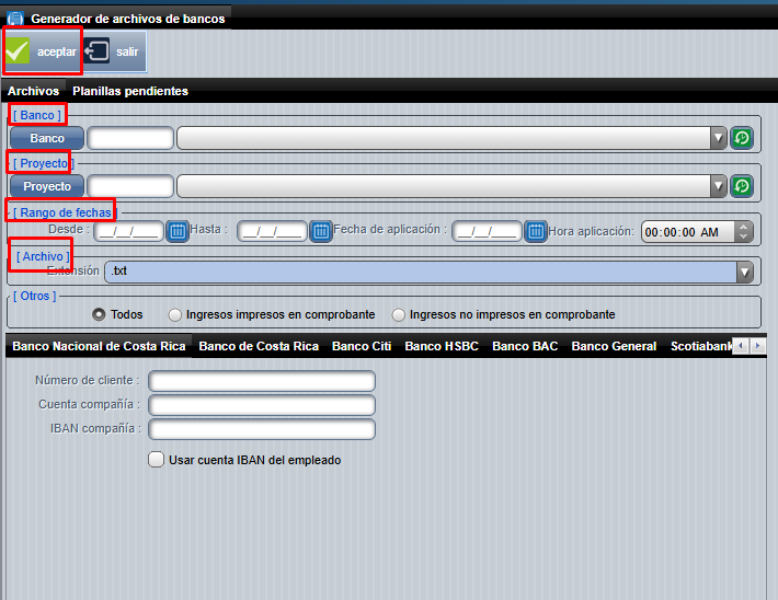 - El generador de archivos de bancos ingresa la información de los bancos con los cuáles la compañía tiene convenio para realizar el pago de planillas de sus empleados.