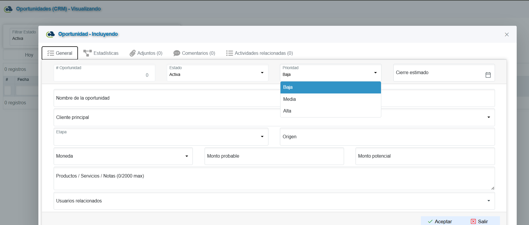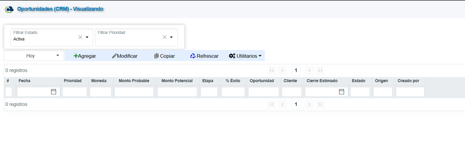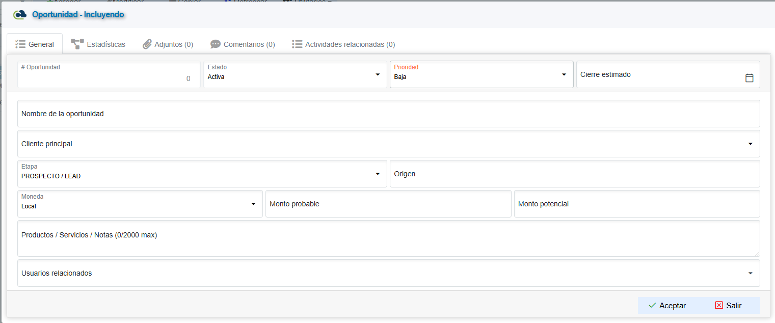 Esta opción nos permite registrar oportunidades las cuáles pueden llevar relacionadas múltiples actividades, usuarios, comentarios y adjuntos.