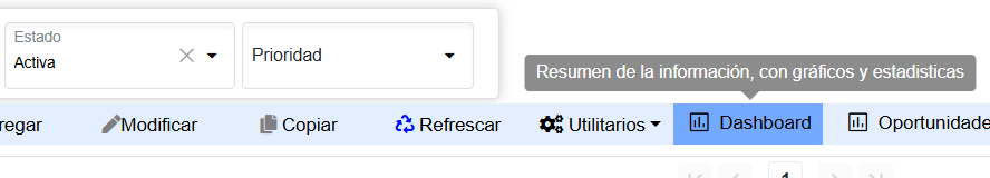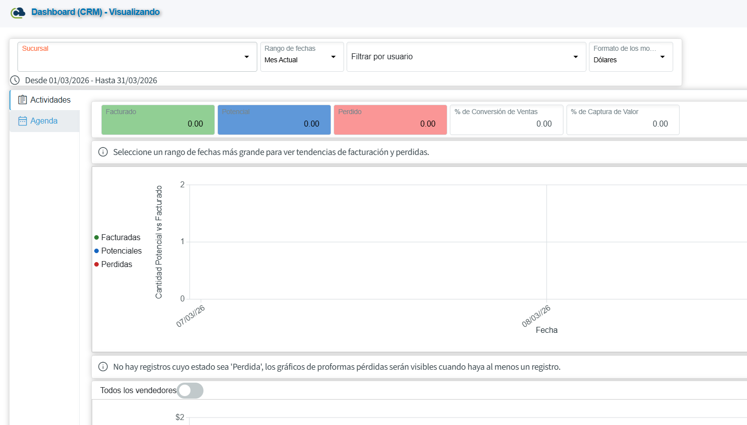 Esta opción nos permite visualizar tendencias sobre montos y cantidades de actividades que ya fueron facturadas, proformadas y actividades marcadas como perdidas.