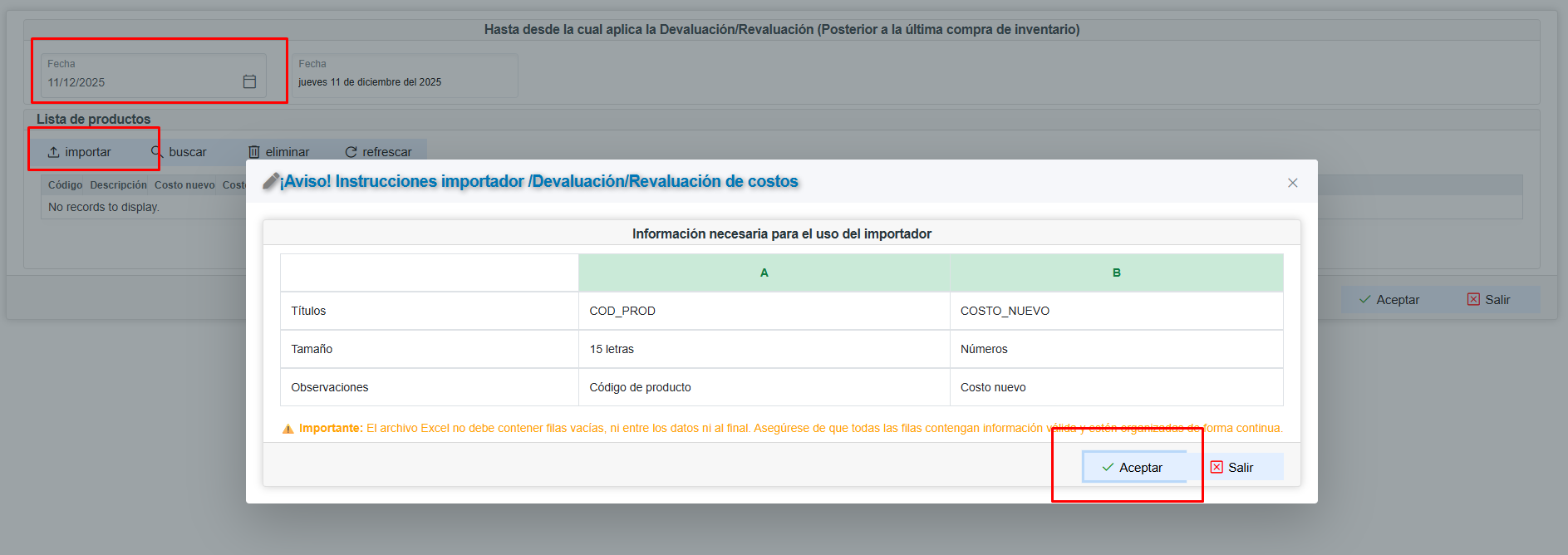 - No pueden haber registros de ajuste de costos para ese producto en la fecha de corte.