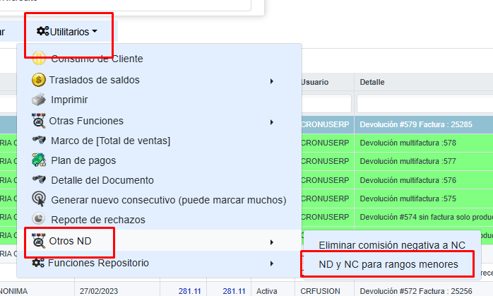 CRONUS Movimientos Documentos Facturaci贸n NC Saldos menores