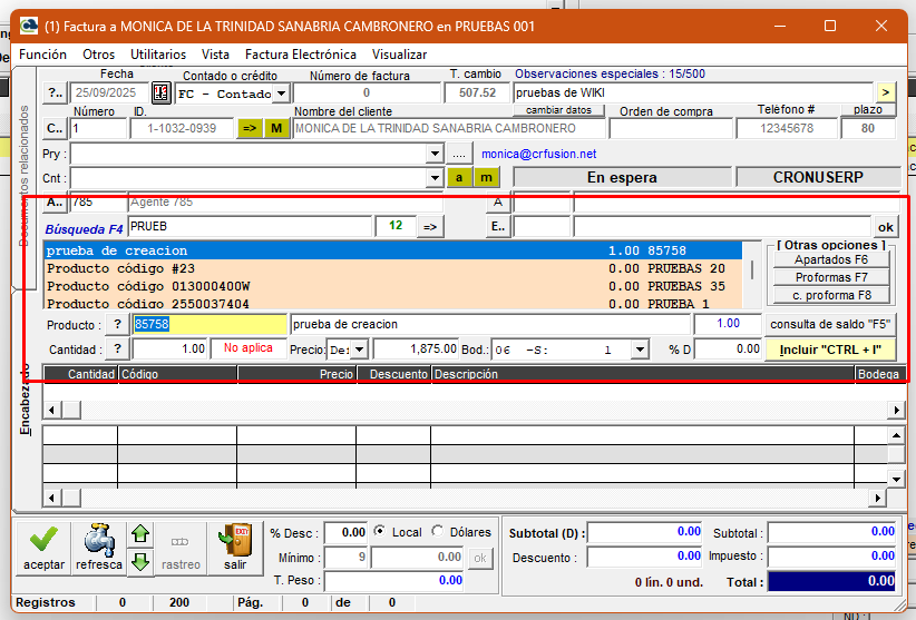 Seguidamente seria el proceso de b煤squeda de productos para facturar, funciona de la misma manera que la b煤squeda de clientes, si usted sabe el c贸digo del producto lo puede digitar en el campo "Producto" o buscarlo digitando palabras claves en el campo que dice "B煤squeda F4". Al hacerlo, el sistema le mostrar谩 todos los productos que contengan esas palabras en su descripci贸n. Para escogerlo y poderlo facturar debe de hacer doble click sobre 茅l. Despu茅s llenar los campos de cantidad, bodega y porcentaje de descuento (si aplica) luego presione el bot贸n "Incluir". Este procedimiento lo tiene que hacer con cada producto que desee facturar. Una vez cargados todos productos, verifique los precios, las cantidades y los descuentos aplicados, si tiene que modificar alguno, solo haga doble click sobre 茅l y modifique la informaci贸n.