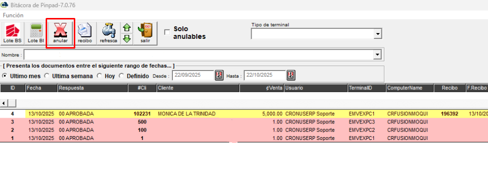 6. De otra forma si no desea cargar la transacci贸n debe anularla en la bit谩cora de Pinpad.