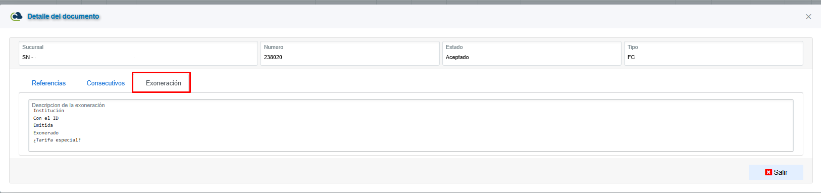 También contamos con una pestaña adicional que muestra la información relacionada con la exoneración, en caso de que la factura cuente con este beneficio: