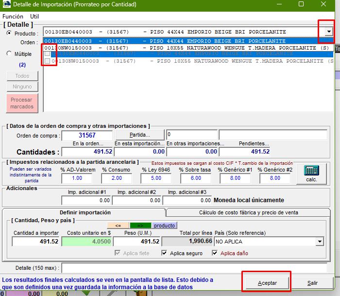 - En las casillas de peso, seguro o flete el usuario podr谩 prorratear este para todos los productos de la importaci贸n o m谩s bien dejar el % 煤nicamente en uno de la lista.聽