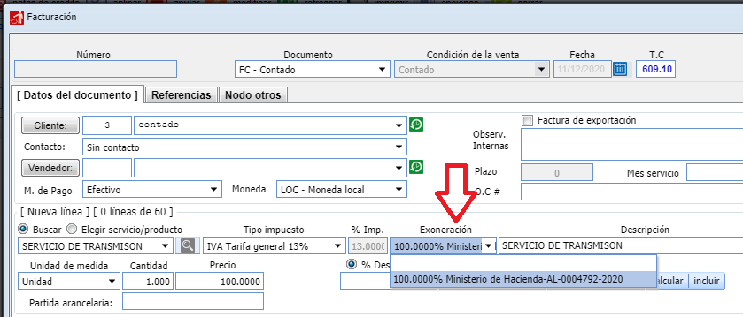 - Ingrese a la pantalla de facturaci贸n, llene los campos del encabezado y escoja el servicio correspondiente, sin modificar manualmente el impuesto.