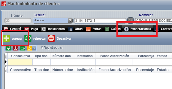 La configuraci贸n de las exoneraciones se debe de realizar por cliente y este debe de estar previamente creado en el sistema.