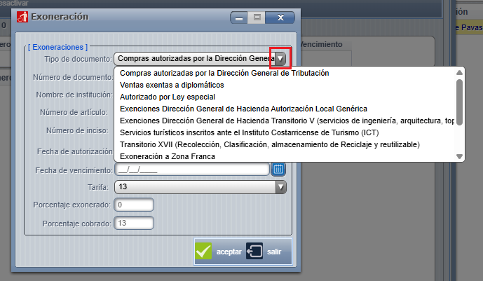 - Tipo de documento: Despliegue el combo de opciones y seleccione la correspondiente:聽 Compras autorizadas, Ventas exentas a diplom谩ticos, Autorizado por ley especial, Exenciones Direcci贸n General de Hacienda, Exenciones Direcci贸n General de Hacienda Transitorio V (Servicios de ingenier铆a, arquitectura, Topograf铆a), Servicios tur铆sticos inscritos ante el ICT, Transitorio XVII (recolecci贸n, clasificaci贸n, almacenamiento de reciclaje y reutilizable) y Exoneraci贸n a Zona Franca, Exoneraci贸n de servicios complementarios para la exportaci贸n, 脫rgano de las corporaciones municipales, Exenciones Direcci贸n General de Hacienda Autorizaci贸n de impuesto Local Concreta, Otros聽 .