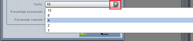 - Tarifa: Despliegue el combo de opciones y seleccione el porcentaje aplicable si el cliente no contara con la exoneraci贸n (13, 8, 4, 2 贸 1%).