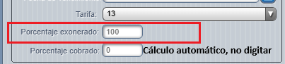 - Porcentaje de exoneraci贸n: Indique con n煤meros el porcentaje de exoneraci贸n otorgado. Por ejemplo, si la empresa est谩 exonerada del 13% del IVA, debe de ingresar 100%, ya que equivale a una exoneraci贸n total. El sistema calcular谩 autom谩ticamente el campo "Porcentaje cobrado".