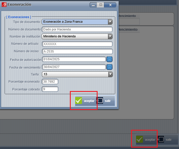 Una vez completada la informaci贸n, presione el bot贸n "Aceptar" en la pantalla de exoneraciones y nuevamente "Aceptar" en la pantalla de detalle de clientes para guardar los cambios. Cada cliente puede tener m煤ltiples exoneraciones configuradas.
