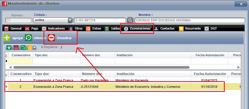 - 聽Seleccione la exoneraci贸n correspondiente y presione el bot贸n "Desactivar" en la barra superior.