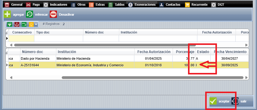 Las exoneraciones vencidas o con errores deben de inactivarse. Para hacerlo: