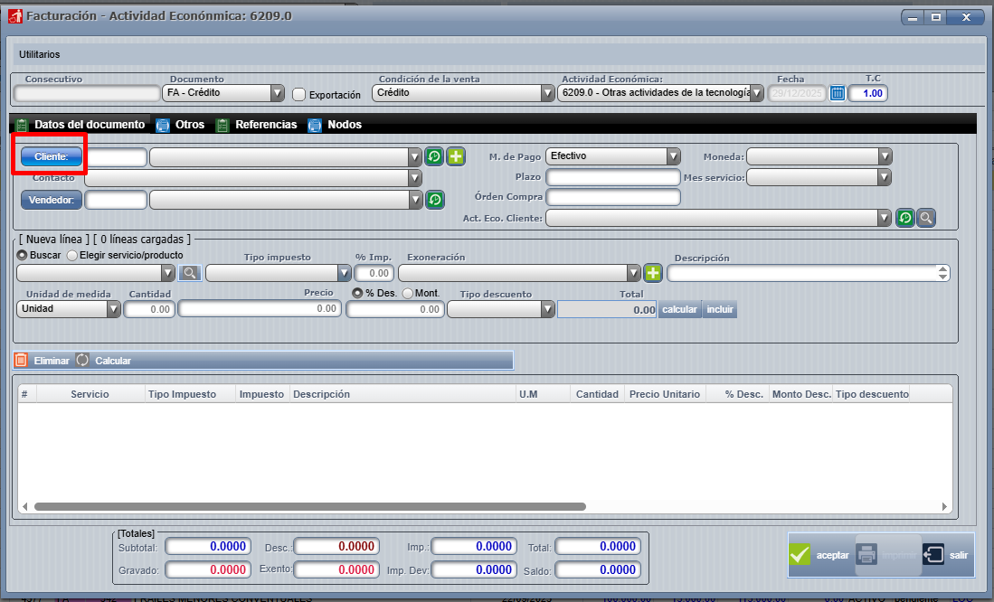 Para crear una factura nueva presionamos el botón de “Facturar “ubicado arriba a la izquierda de la pantalla. Lo primero que debemos de hacer es identificar el tipo de documento, si es factura de crédito, contado o si es una nota de débito y luego el tipo de factura. La fecha es sugerida de forma automática por el servidor.