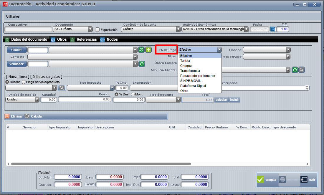 M. de pago tiene diferentes opciones de pago: efectivo, tarjeta, cheque, transferencia y recaudado por terceros.