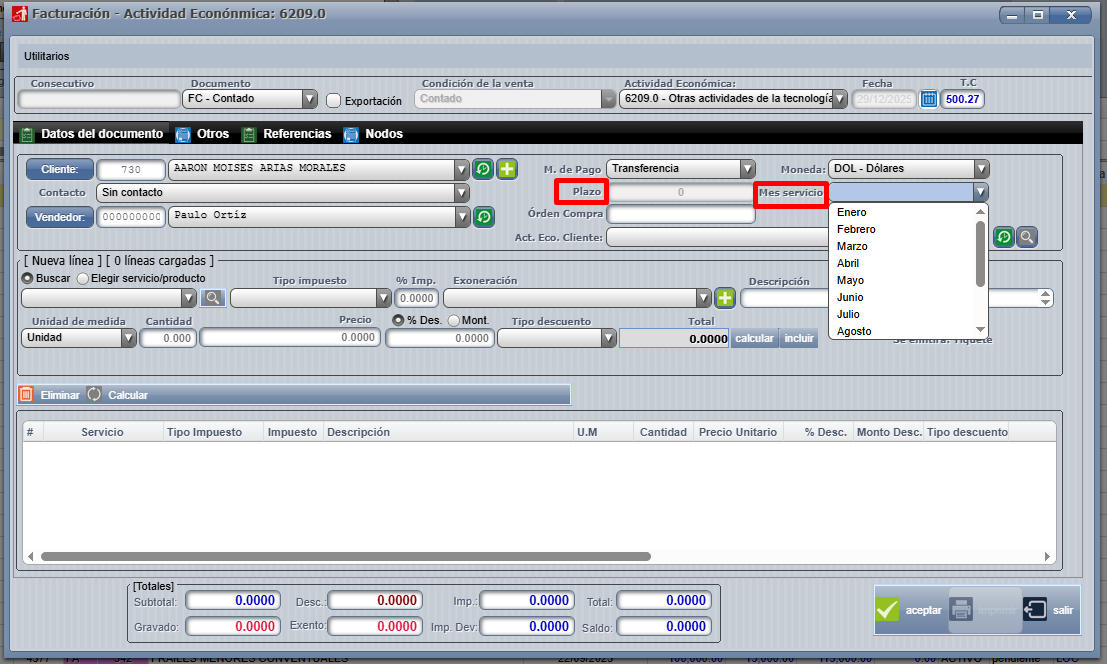 El siguiente campo es el de “ vendedor “; este es opcional, si no tiene definido ninguno o para sus efectos no le sirve, puede dejar el campo en blanco.