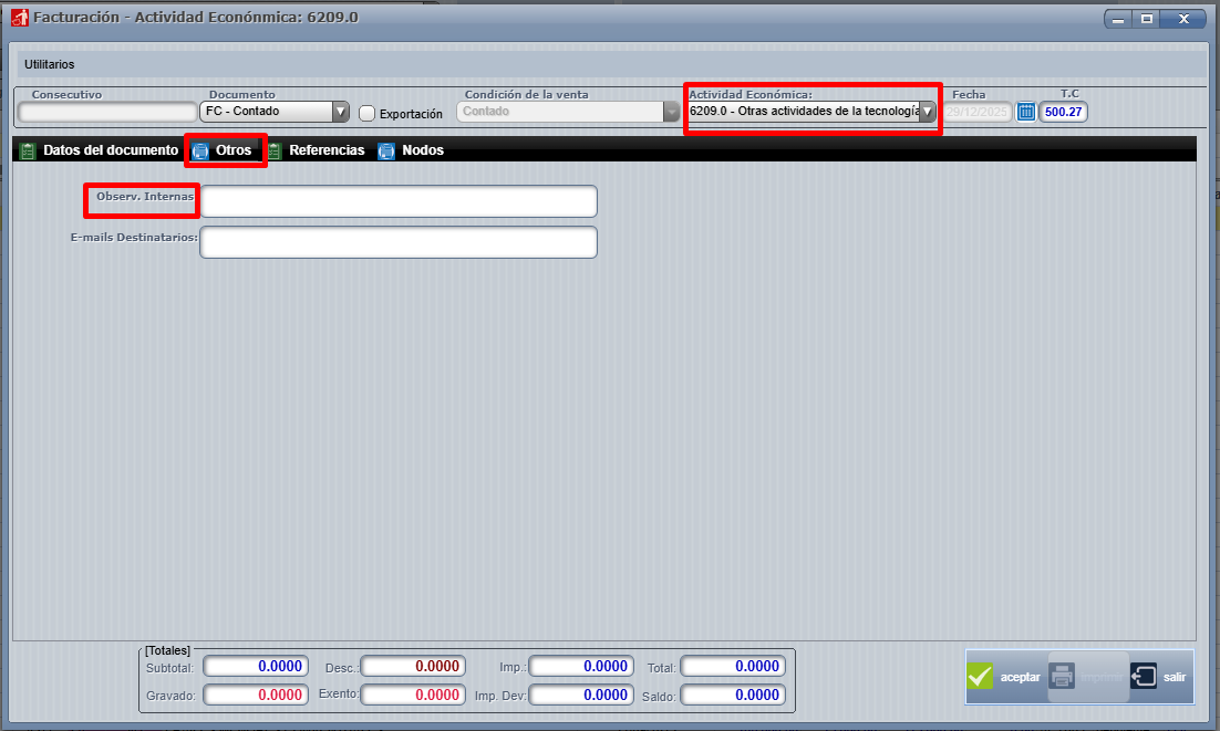 Observ. Internas, en él puede hacer anotaciones o recordatorios para usted como usuario, estas observaciones NO saldrán impresas en la factura. Tomar en cuenta que una vez hecha la factura estos datos no pueden ser modificados, en caso de que estén mal; debemos de anular el documento con una nota de crédito.