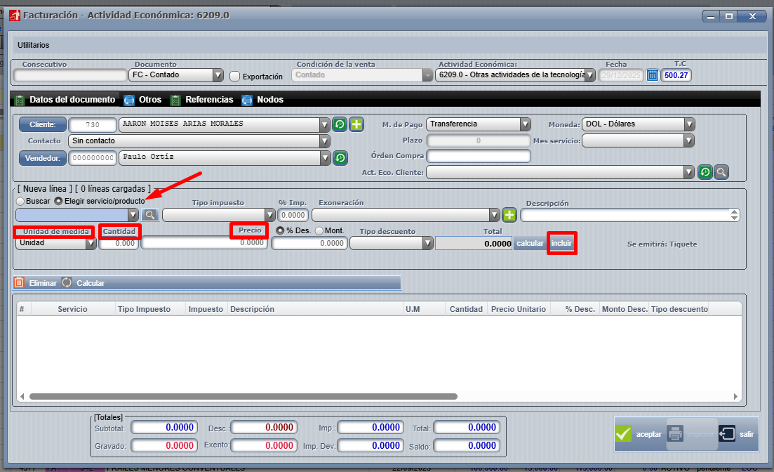 2- Precio unitario: al variar el campo debe dar clic en la opción calcular para actualizar el monto de la factura.