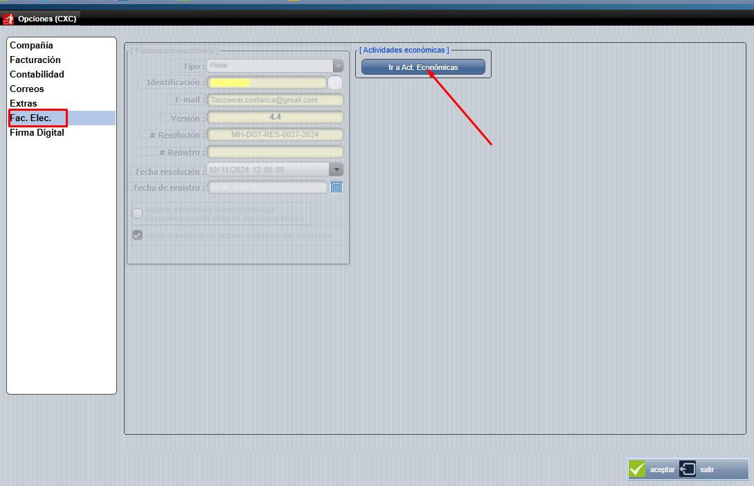 En la cejilla de Fac.Elec, esta pantalla está dividida en dos partes, una relacionada a los datos de la Facturación Electrónica (Información bloqueada) y la otra relacionada a las Actividades Económicas si presionamos ahi nos lleva a la configuración de la AE