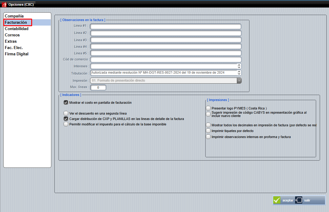 En la cejilla de facturación aquí podemos hacer otras configuracion para que salgan impresas en nuestra factura