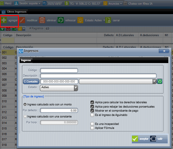 Para iniciar debemos de configurar un nuevo ingreso, nos vamos a Mantenimientos聽=> Ingresos y deducciones聽=> Otros ingresos