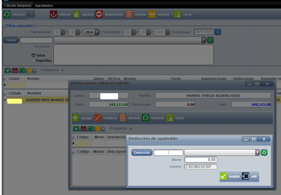 Cuando ya revisamos y vemos que todo est谩 correcto presionamos el bot贸n de "Aprobar", este proceso genera de forma inmediata y c谩lculo de planilla para cada proyecto y para cada empleado este calcul贸 solo contiene el ingreso de aguinaldos las horas ordinarias, extras y dobles en cero.
