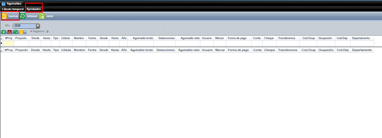 En la cejilla de aprobados es para revisar los aguinaldos aprobados a los que se le calcul贸 el aguinaldo, aqu铆 podemos reversar el calcul贸 de uno o de todos los aguinaldos presionando marcar o desmarcar y luego presionando eliminar.