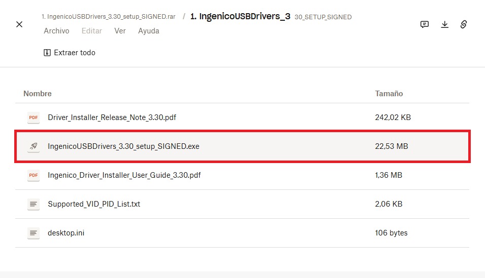 Dentro de la carpeta debemos de descargar el archivo enmarcado y colocarlo en la carpeta de nuestra computadora llamada聽"Drivers-Pinpad" creada previamente.