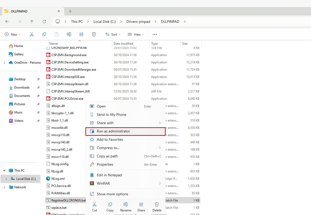 Ahora en la carpeta extra铆da encontraremos un archivo llamado "RegistrarDLLCRONUS,bat", a este archivo tendremos que seleccionarlo con click derecho y oprimir enla opci贸n de "Correr como administrador":聽