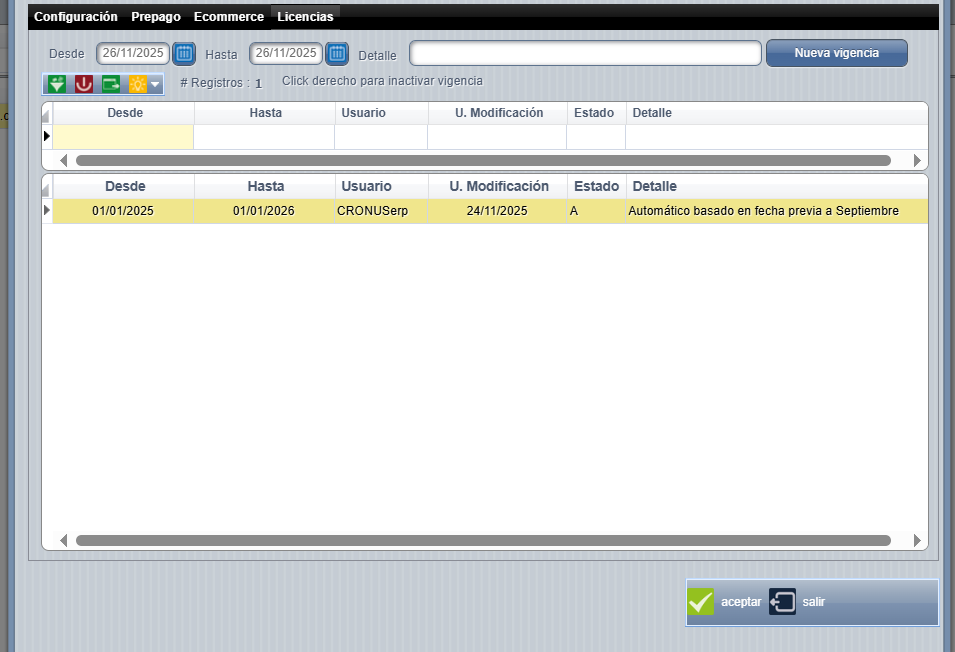 La licencia y vigencia activa pueden visualizarse en la parte superior del menú principal, debajo de la compañía seleccionada.