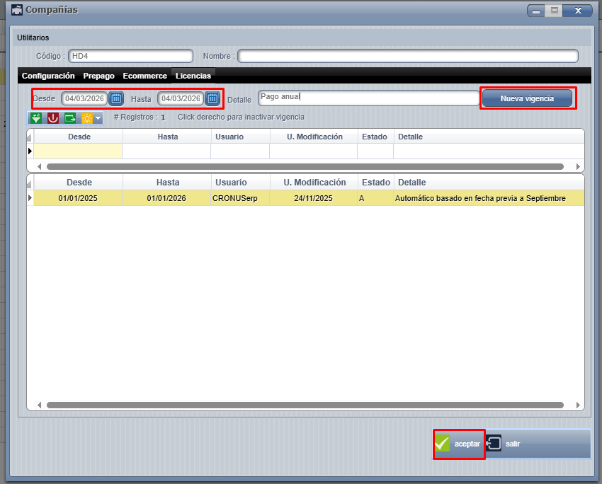 Licencias y Vigencias en Compañías