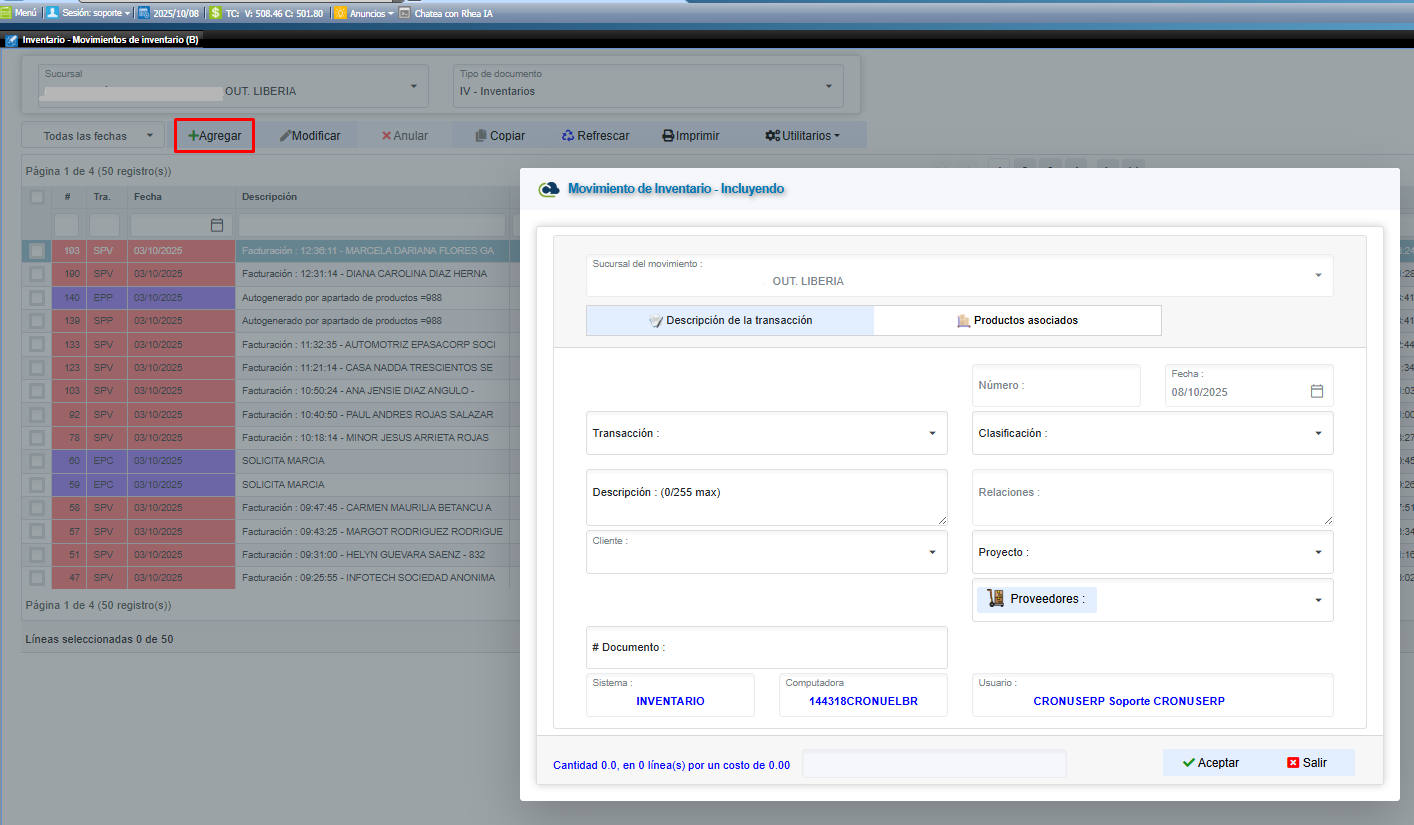 Una vez en esta pantalla el sistema nos mostrar谩 las opciones para incluir el movimiento que requerimos, y para esto debemos presionar en "Agregar" y as铆 el sistema nos emerge la pantalla para cargar el mismo:聽